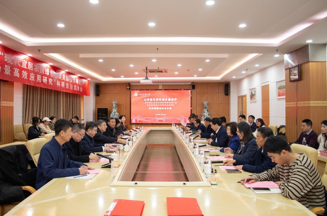 11月12日上午,山东省住房和城乡建设厅《现代宜居农房绿色低碳关键技术研究》暨《光伏发电系统多场景高效应用研究》科研课题启动会议在山东建筑大学顺利举行,会议同期举办了《绿色农房建设图集》政府采购事项委托合同签约仪式。山东省住房和城乡建设厅二级巡视员刘春藏、节能与科技处副处长陈恒亮、村镇建设处处长李晓、标准造价中心主任胡雪晶、发展研究院院长赵元刚,汶上县住建局、同圆设计集团、中建八局第一建设有限公司、山东华能保温材料有限公司、山东金佰城装配式建筑科技有限公司、山东力诺瑞特新能源有限公司、和能人居科技集团股份有限公司等企事业单位负责人出席了会议。山东建筑大学副校长赵继龙参加会议并致欢迎辞。