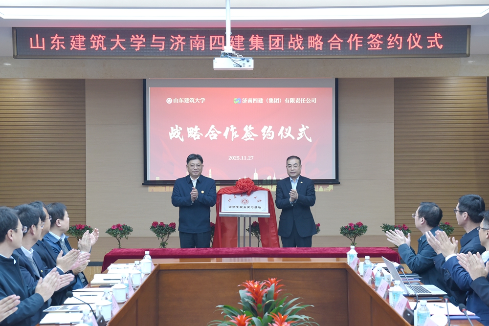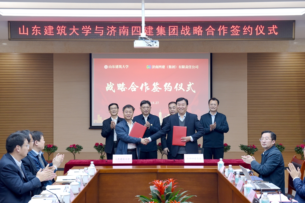 11月27日,山东建筑大学与济南四建(集团)有限责任公司战略合作协议签约仪式在济南四建集团举行。济南四建集团党委书记、董事长史拥军,山东建筑大学党委书记杨景波出席仪式并讲话。济南四建集团党委副书记、总经理尚华,党委委员、副总经理江元华,副总经理葛军,山东建筑大学党委副书记、校长于德湖,党委委员、副校长张志刚等领导出席签约仪式。济南四建集团党委副书记、纪委书记、工会主席兰利孝主持签约活动。