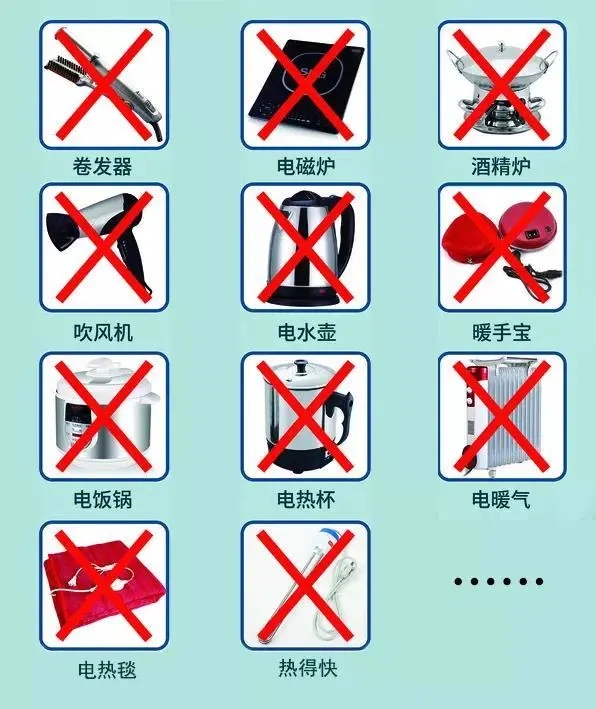 1. 禁用大功率违规电器:宿舍供电线路按基础用电标准设计,严禁使用“热得快”、电暖器、电炉、电热锅等大功率电器。