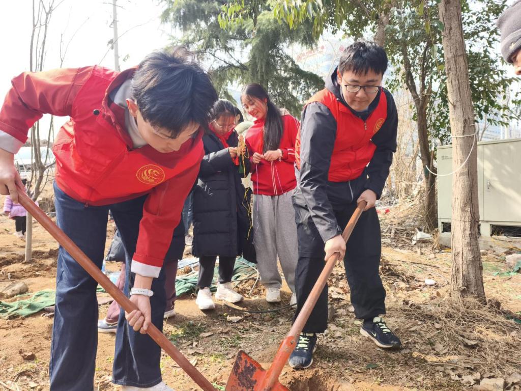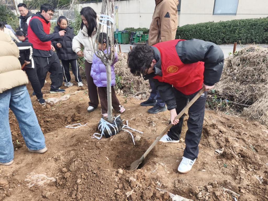 经过一个多小时的共同努力,三十余棵新栽种的树苗在春风中昂然挺立,原本空旷的土地上焕发出勃勃生机。新绿与身着红马甲的志愿者、佩戴红领巾的小学生交相辉映,构成了一幅动人的春日画卷。