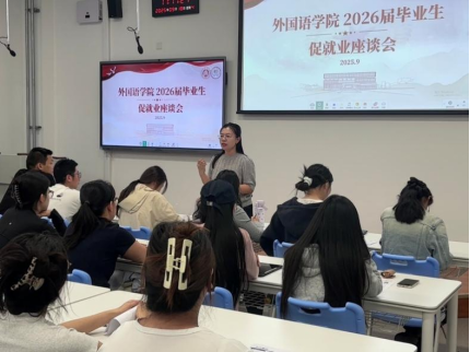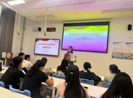 刘莹结合目前就业形势和社会发展实际,鼓励大家发挥专业优势把握行业机遇,她提出三点建议:一是认清形势,当前社会发展对复合型外语人才需求持续增长,机遇与压力并存,希望同学们立足实际,勇敢尝试,积极就业。二是善用资源,党员和学生干部要以身作则,发挥模范带头作用,主动了解同学们的就业需求和困惑,及时收集和整理各类就业信息,服务同学。三是找准定位,要求同学们按培养计划规定时长实习,尤其是“考研+求职”双线准备的同学要把握求职黄金期,转变观念,主动出击。