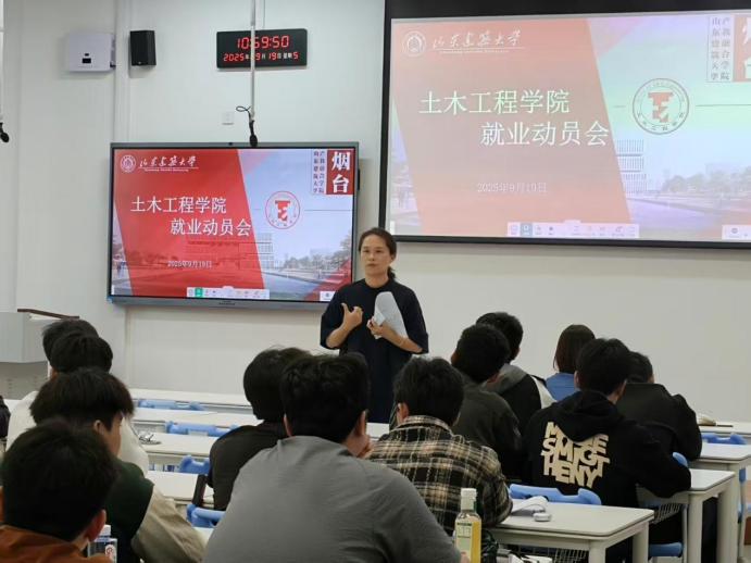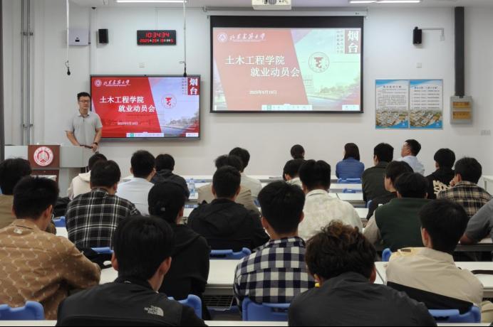 为全面推进2026届毕业生就业工作,进一步引导毕业生树立正确的就业观念,切实提高毕业生的就业竞争力,9月19日,土木工程学院于产学研基地(烟台)XA208教室召开2026届毕业生就业动员会。学院党委书记范倩、党委副书记王培森、毕业班辅导员代表及土木工程(中外合作)2026届全体毕业生参会。