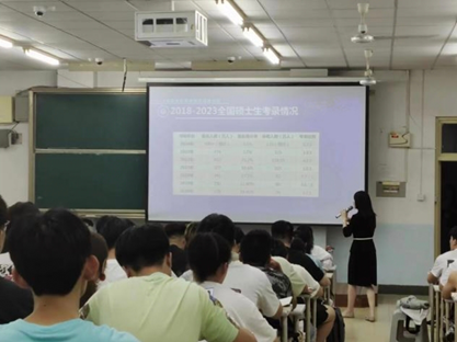 马老师对近几年研究生招考专业,报考人数变化等形势进行了分析,同时,向同学们展示了2018年~2023年全国硕士生招录情况以及研究机构竞争格局分析,接着马老师分析了英语考研试卷的类型和分值占比,最后向同学们进行了考研初试全流程解读。