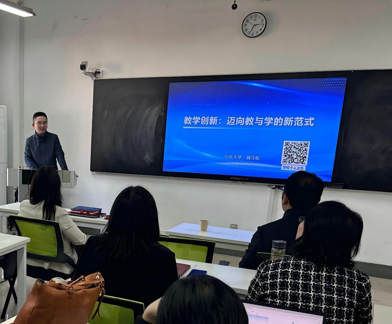 11月13日,法学院特邀山东大学副教授,山东省高校教师教学创新指导专家,山东省高校青年教师教学能力提升讲座专家魏雪松老师于外文楼415教室作题为 “教学创新:迈向教与学的新范式”的专题讲座。法学院副院长刘宝臣主持讲座,院长朱宝丽、副院长王翠敏、学术副院长申荣荣出席,学院全体教师参加。