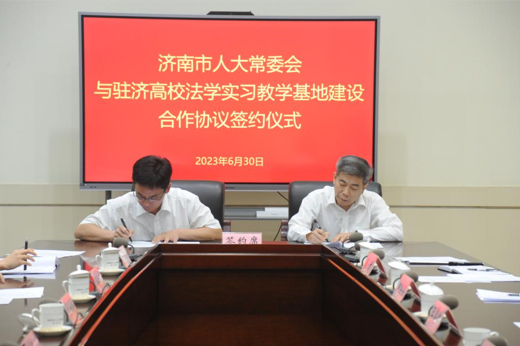 市人大常委会副秘书长、办公厅主任吕洪涛与副校长李青副签署了《济南市人大常委会与驻济高校法学实习教学基地建设合作协议书》。