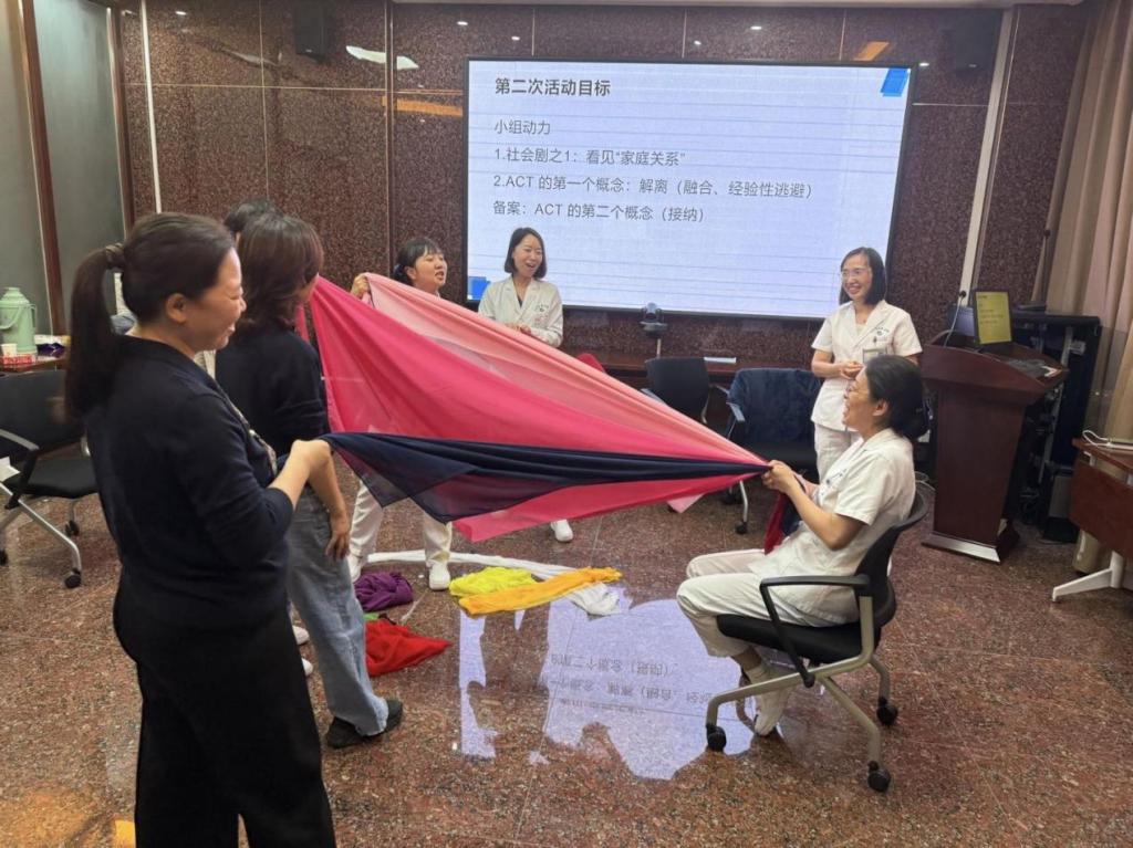 活动全程以体验式学习为核心,融合多种专业方法与理论,助力护士长群体纾解家庭关系压力、提升家庭坚韧力。暖身环节通过呼吸放松、音乐引导下的心情卡片分享等形式,帮助组员快速破冰、建立信任,还鼓励组员自主组队寻找共同点,为后续互动奠定基础。核心实践阶段,团队创新运用丝巾雕塑模拟、家庭角色扮演、社会剧场景演绎等方式,直观呈现家庭关系中的各类要素与互动模式;解析情绪管理与行为价值,结合 ACT(接受与承诺疗法)核心概念,分阶段指导组员掌握 “解离” 技能 —— 通过负面评价分享、歌唱表达情绪等形式,帮助大家从固化角色与负面情绪中抽离,以及 “接纳” 技能 —— 借助动物卡片家庭故事分享、角色互换演绎等,引导组员理解家庭动力,学会以非评判态度对待家人与自我。同时,正念冥想贯穿活动,组员将负面情绪 “寄托” 于绿叶,在放松中学习压力调节。活动始终坚守保密原则,组员共同签署小组契约,最后以手拉手祝福、合影留念等温馨环节收尾,在回顾所学的同时,为实践画上圆满句号。