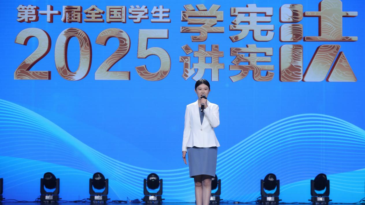 比赛分为主题演讲和命题演讲。在主题演讲环节,宫文静以《视障群体的“光明”》为题,以自身术后短暂“失明”的真切体验为切口,以小见大,生动阐述了宪法对特殊群体平等权利的保障,展现了法治中国所蕴含的民生温度与人文关怀。在命题演讲环节,宫文静以《发展体育事业,增强人民体质》为题,号召青年积极投身体育锻炼,以强健体魄共筑体育强国梦想。经过两轮角逐,宫文静凭借出色表现,斩获高校组一等奖。
