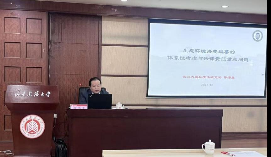 11月28日上午,法学院在厚德学堂举办题为《生态环境法典编纂的体系性考虑与法律责任重点问题》的专题讲座。本次讲座特邀教育部青年长江学者、武汉大学环境法研究所副所长、博士生导师陈海嵩教授担任主讲嘉宾,学院青年教师、部分本科生和研究生参加。
