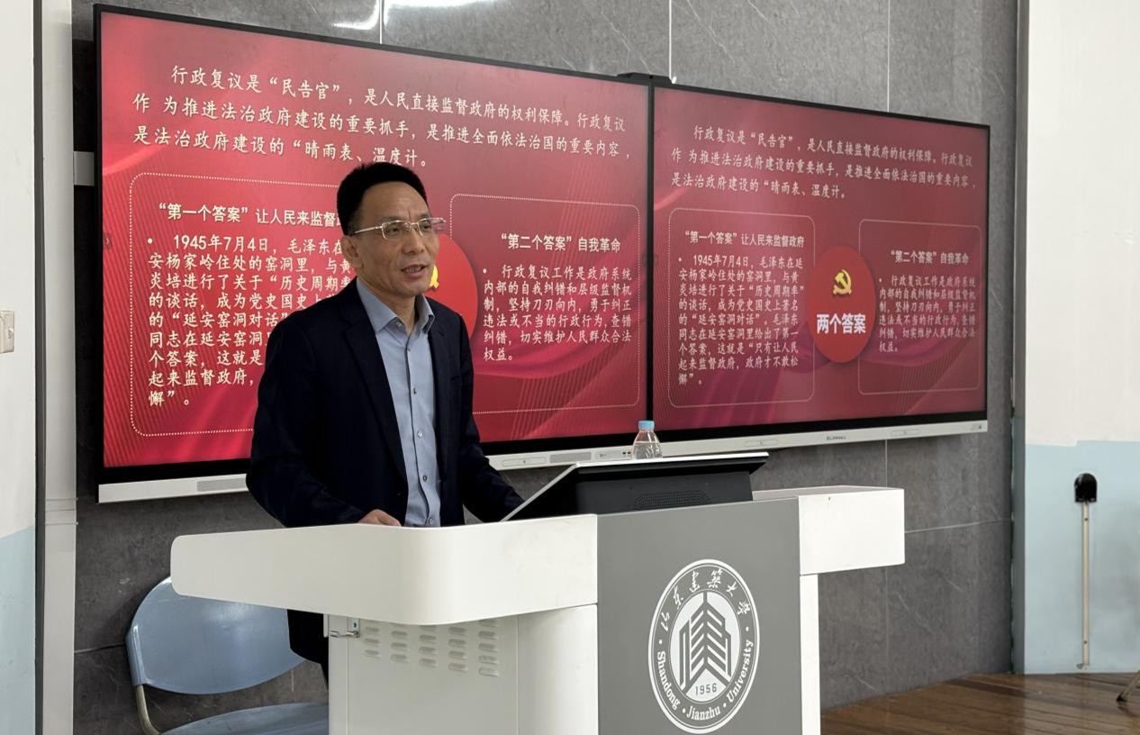 12月17日下午,法学院邀请山东省司法厅行政复议与应诉一处处长孔超在山东建筑大学博文楼107开展“行政复议实务前沿”讲座,法学院讲师姚天担任本次讲座的主持人,学院院长朱宝丽教授、刘国涛教授出席该活动,法学23级全体学生、部分24级研究生参加。