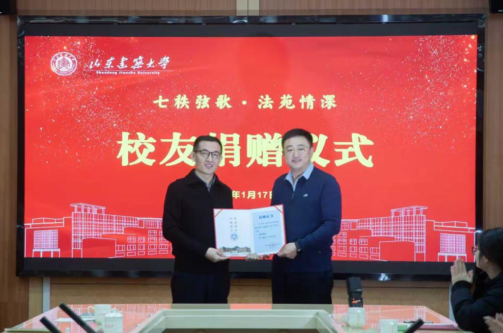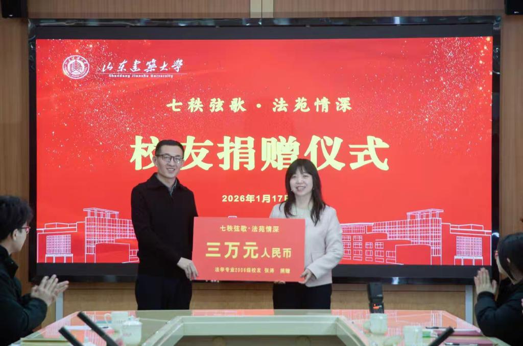 苑情深暖人心,薪火相传续华章。1月17日,山东建筑大学“七秩弦歌・法苑情深”张涛校友捐赠仪式在博学会议室举行。张涛是我校法学专业2006级优秀校友,现任鲁信创业投资集团股份有限公司能源科技投资部总经理,本次以个人名义向学校捐款3万元。学生工作部、校团委、合作发展办公室有关负责人、法学院党政班子及学院校友分会负责人参加了会议。