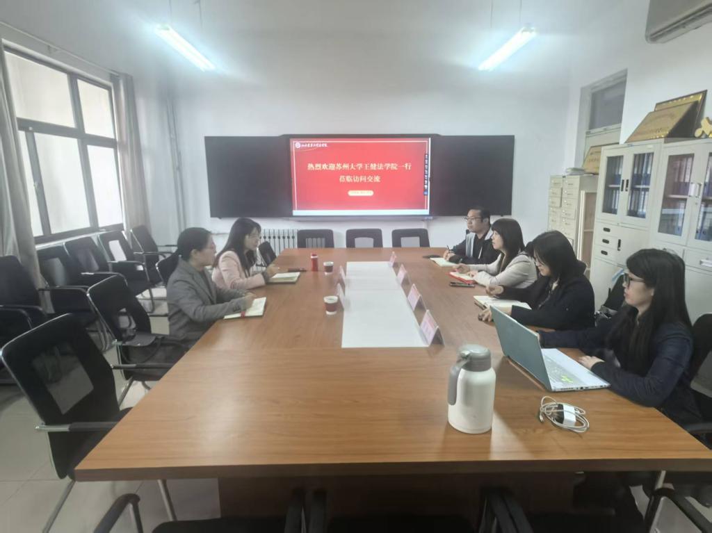 随后,双方重点就法学学科内涵建设、复合型人才培养、涉外法治人才培育、国际合作项目拓展、教学科研资源共享等内容展开深入研讨。苏州大学王健法学院分享了国际联合培养项目的课程设置、学分互认、招生选拔、语言教学、海外衔接等实操经验,为我院推进涉外法治人才培养、拓展国际合作渠道提供了重要参考。我院也就工程法学特色建设、中外合作办学、校地协同育人等做法进行了交流探讨。双方一致认为,新时代法学教育面临新机遇新挑战,加强兄弟院校交流合作、互学互鉴优势经验,对推动学科升级、提升人才培养质量意义重大。双方希望以此次交流为起点,建立常态化沟通机制,在师资互访、学术研讨、课程共建、国际项目合作等方面探索更多合作可能。