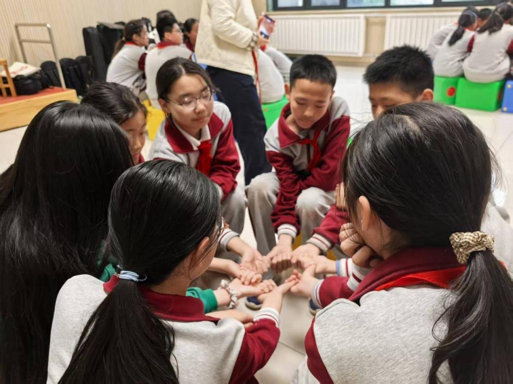 为凝聚团队力量,工作员以“爱的报数”将全体同学分成6个小组,每组由一名工作员全程陪伴引导。随后通过“聚力大挑战・口号大接龙、“雨点变奏曲”暖身游戏,让孩子们在灵动互动中打破陌生感,快速融入轻松愉悦的活动氛围,让孩子们在默契配合中感受团队同心的强大力量。