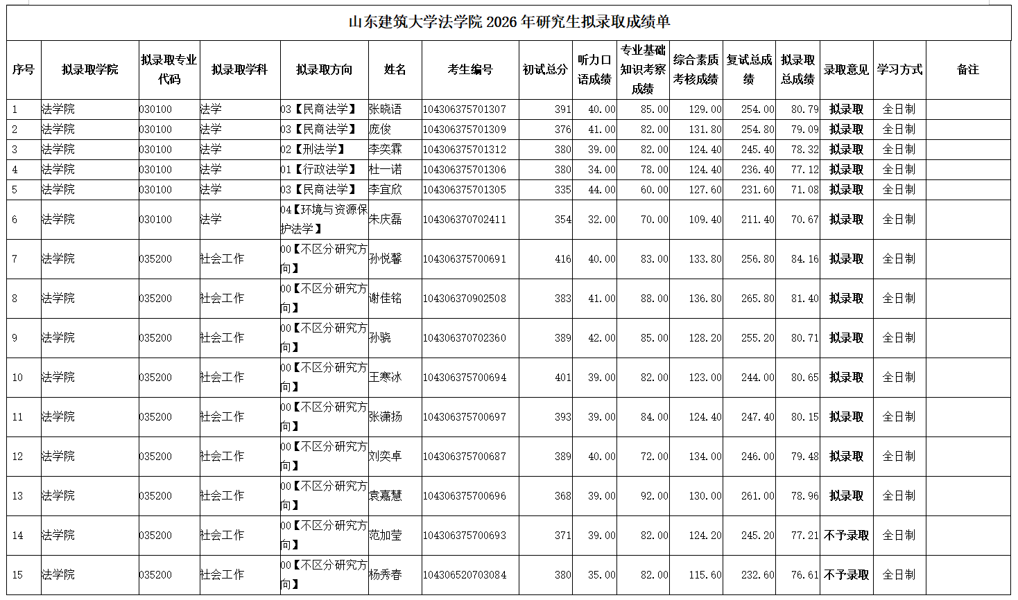 根据教育部、山东省考试院相关文件要求,山东建筑大学法学院2026年硕士研究生招生考试一志愿复试工作已结束,拟录取名单现予以公示。最终录取名单以山东省教育招生考试院和教育部审核通过为准。