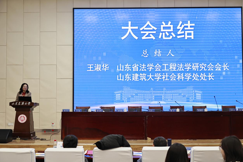 闭幕式由山东建筑大学法学院学术副院长申荣荣主持,山东省法学会工程法学研究会会长、山东建筑大学社会科学处处长王淑华作总结发言。她指出,本次会议围绕“高水平对外开放与城市更新背景下的建筑法新格局”展开深入研讨,成果丰硕,并强调需推动理论成果向实践转化,切实弥合知行差距,呼吁各界携手搭建交流平台,共同为工程法治与“修法·出海”贡献力量。最后,对参会的各位领导嘉宾、专家学者以及会务团队表示衷心感谢,祝愿大家返程顺利,期待未来再聚泉城,共绘工程法治新图景。
