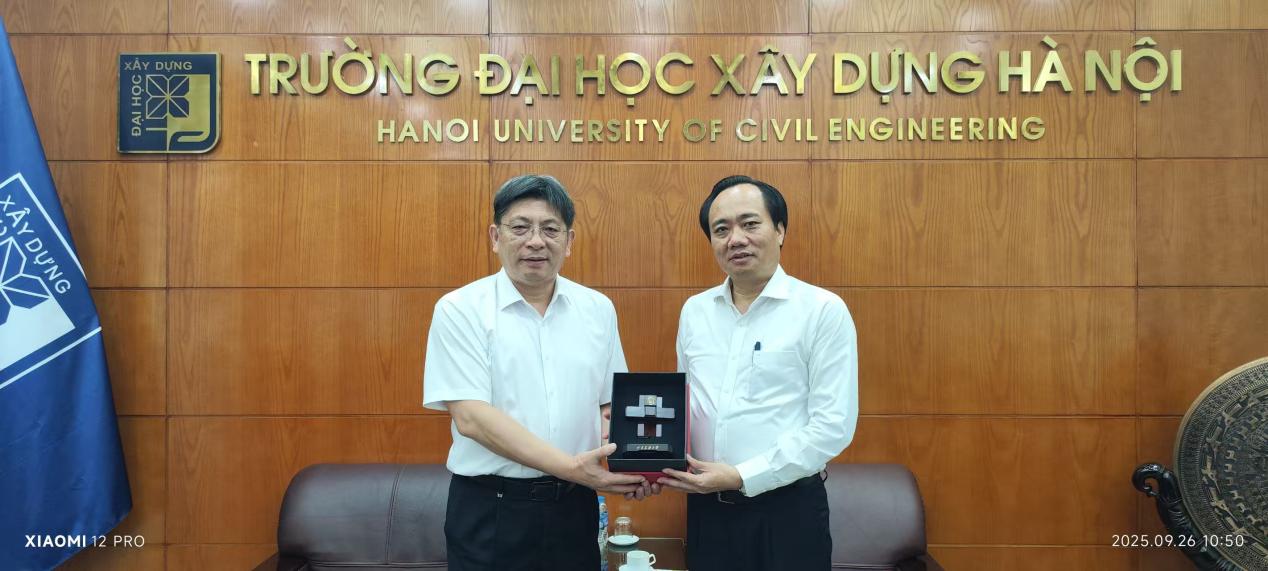 在访问河内建设大学期间,代表团与河内建设大学党委书记兼校长范春英、副校长阮黄江等进行了会谈,并签署了两校合作谅解备忘录。双方基于两校相似的发展历史和高度相近的学科专业设置,就师生交流、研究生联合培养、合作科研等方面进行交流,特别是依托两校的设计集团,加强在绿色建筑领域的合作与研究,共同推动两校的合作与发展。双方均表示,两校开展务实合作,互相支持,共同发展,并表示互相参加两校2026年的70周年和60周年校庆系列活动。