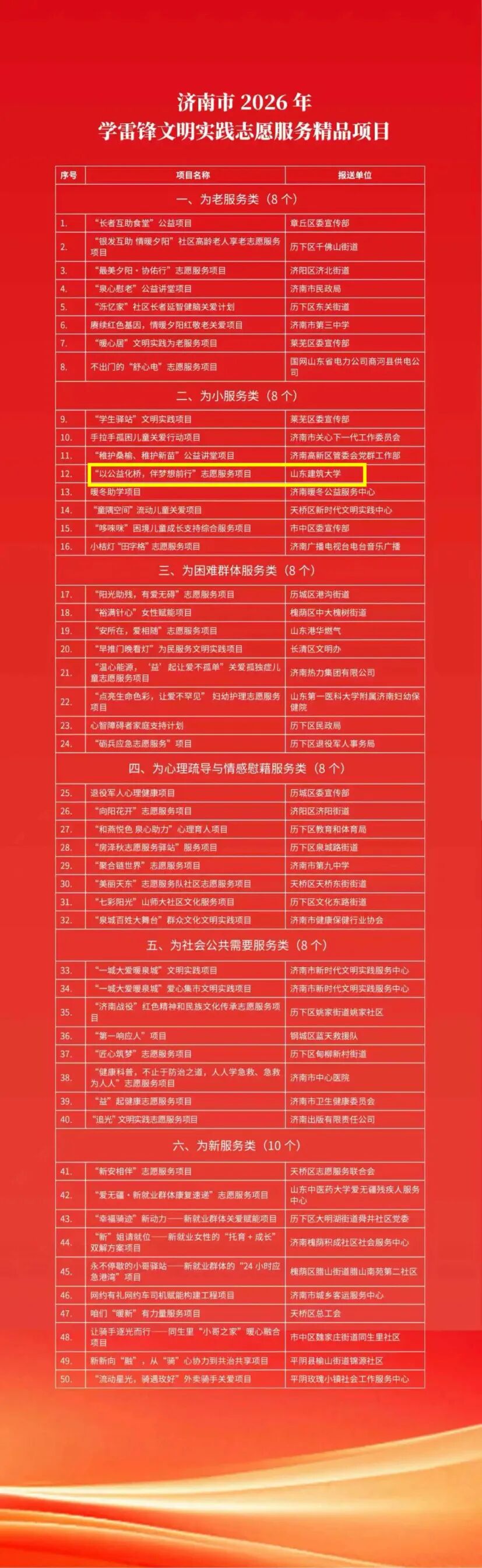 近日,济南市2026年学雷锋文明实践志愿服务精品项目名单正式发布,在全市入选的50个精品项目中,山东建筑大学交通工程学院申报的“以公益化桥,伴梦想前行”志愿服务项目成功入选。
