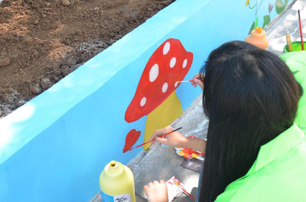 实践活动开始,学生们携带颜料、画笔等工具提前到位,分工明确,线条组以精准笔触勾勒画面轮廓,为进一步创作打下基础;调色组对照设计稿细致调配色彩,确保色调统一和谐;上色组则专注细节填充,耐心处理边缘衔接,严防颜料溢出。志愿者们以热忱传递创作初心,让现场不仅是开展公益实践的地方,更化作触摸温暖的互动港湾。