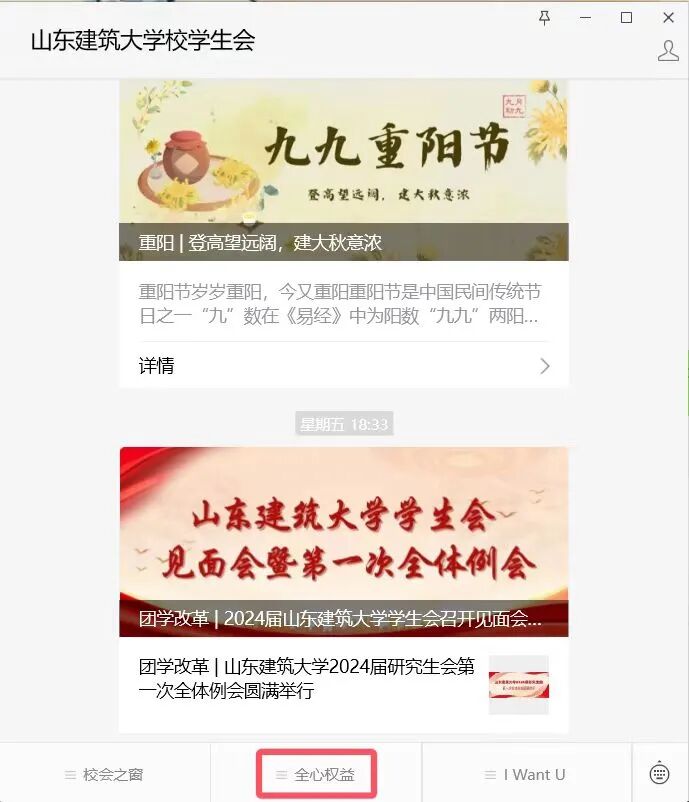 1.微信公众号:关注山东建筑大学校学生会微信公众号,点击“全心权益”板块进行反馈。