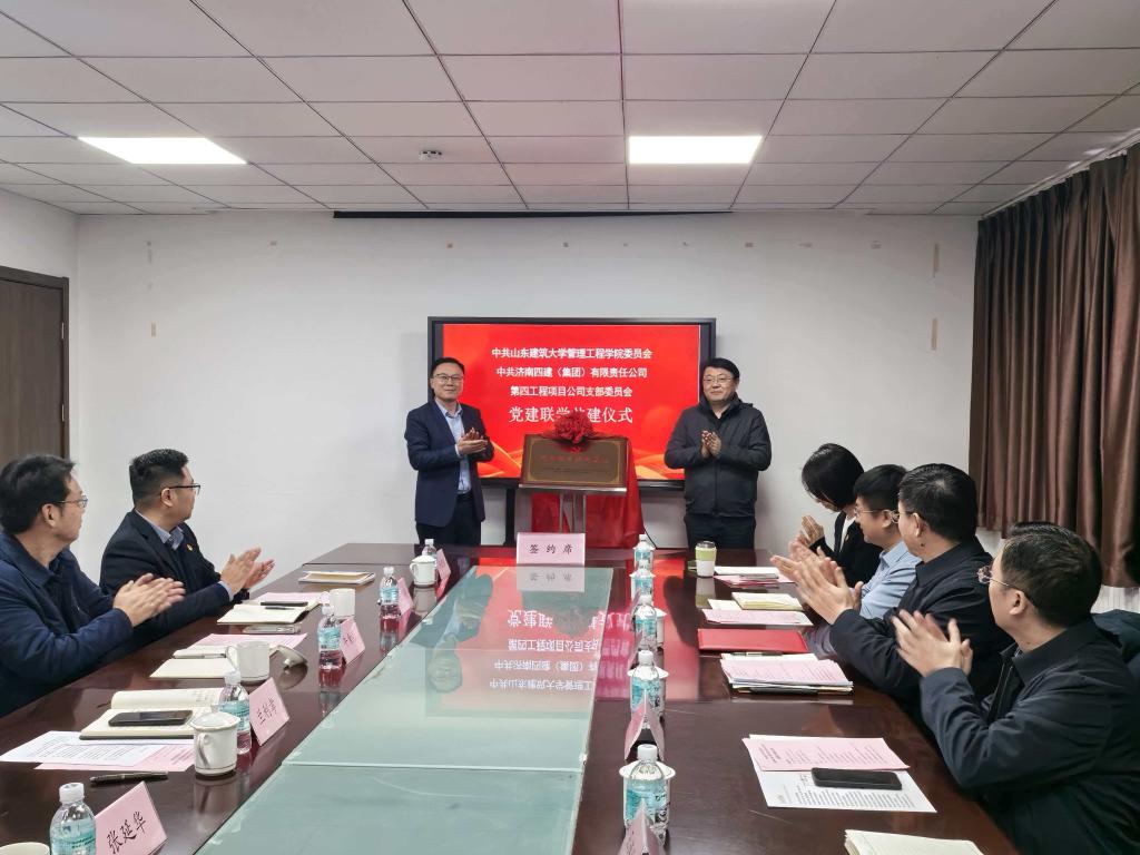 为深入贯彻落实新时代党的建设总要求,充分发挥高校学科优势与企业资源优势,以党建引领推动产学研深度融合,12月26日,管理工程学院与济南四建(集团)第四项目公司在济南四建(集团)总部开展党建联学共建活动。学校合作发展办公室副主任牟永念,省委党校应急管理培训部副主任王连伟,管理工程学院党委书记邵明辉、党委副书记周莹、副院长曾大林等参加活动。济南四建集团党委副书记、纪委书记、工会主席兰利孝,总工程师牛金泉,工会副主席、党群工作部部长张延华,济南四建集团第四项目公司总经理、党支部书记柏建栋出席活动。济南四建集团第四项目公司副总经理刘光东主持活动。