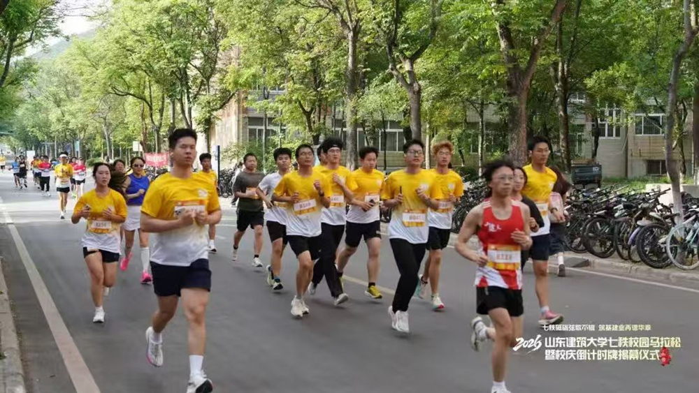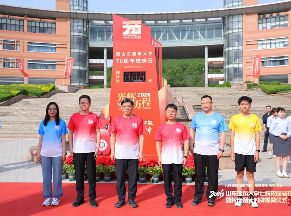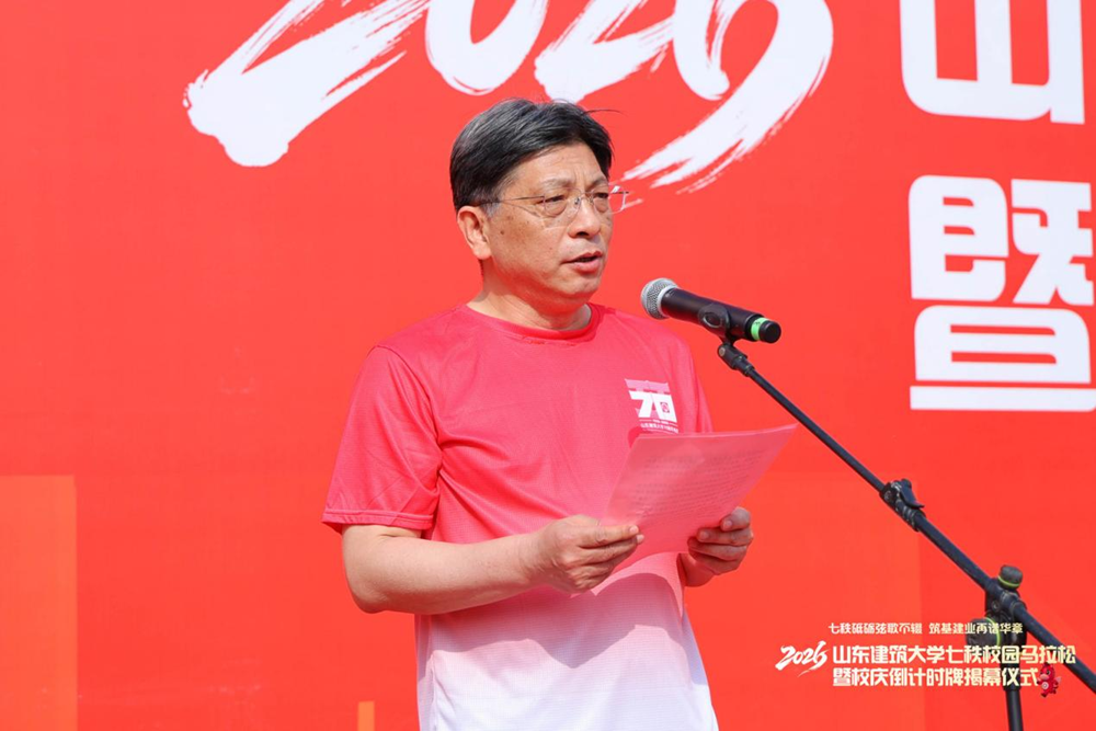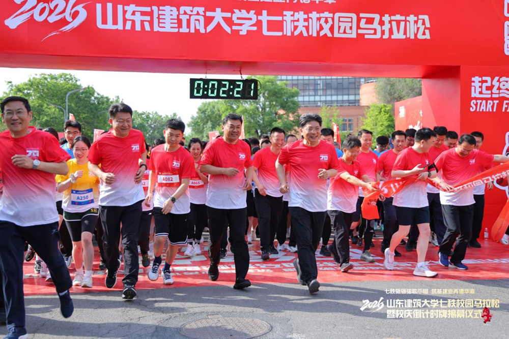 致辞结束后,杨景波、于德湖与校友代表、教师代表、学生代表共同为校庆倒计时牌揭幕。揭幕仪式后,杨景波、于德湖带领学校领导班子成员为10公里跑发令鸣枪,随后3公里欢乐跑接续进行。比赛设校友组、教工组、学生组三个类别,赛道环绕校园核心区域,途经校史馆、火车餐厅等标志性建筑,沿途设有补给点、医疗点与志愿者指引。学校还专门设立“山东建筑大学七秩校园马拉松校友服务站”,为返校校友提供参赛服务。