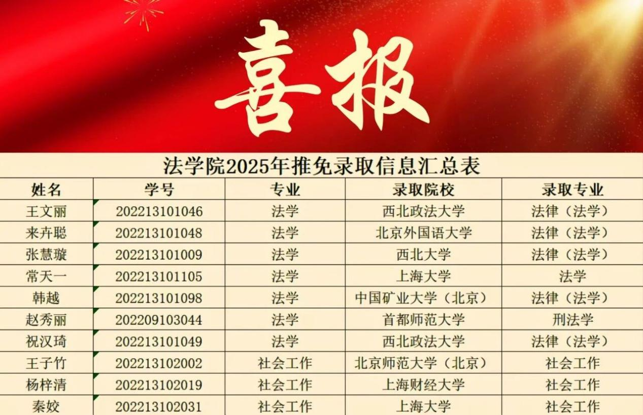 近日,山东建筑大学法学院再添喜讯——2026届10名优秀学子凭借扎实的学业功底与突出的综合素养,历经层层选拔,成功推免至国内优秀高校。