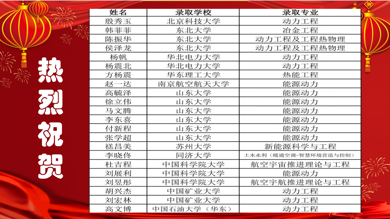 近日,热能工程学院2026届硕士研究生推荐免试工作顺利收官。学院2022级22名优秀本科生凭借出色的综合素质,成功保送至中国科学院大学、山东大学、东北大学等多所985、211高校继续攻读硕士学位。