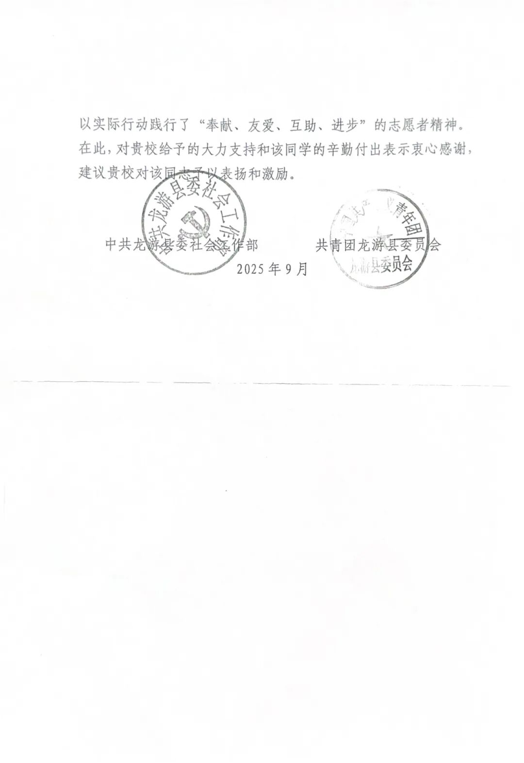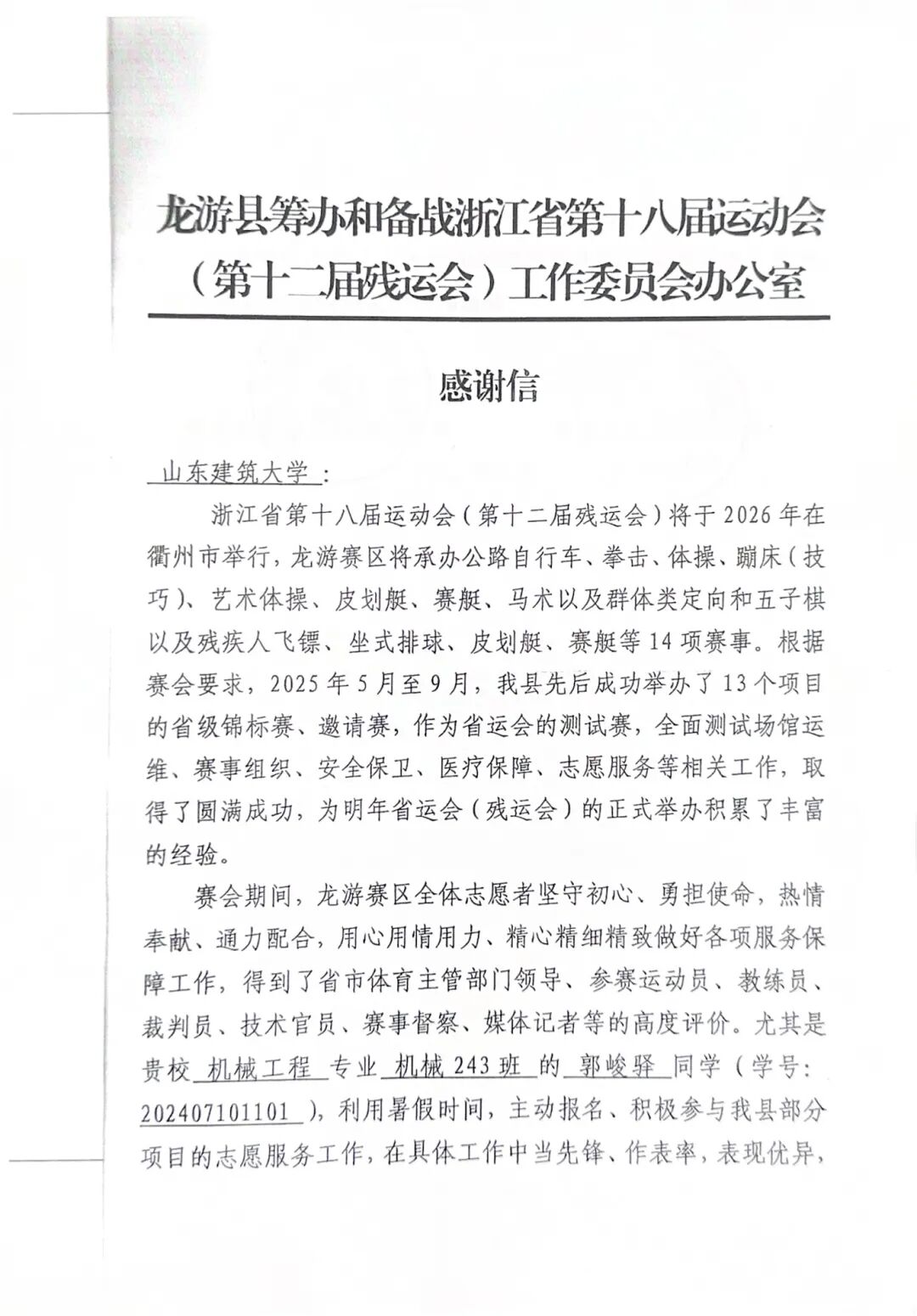 近日,我校收到龙游县委社会工作部、共青团龙游县委员会发来的感谢信。信中对我校在龙游赛区运动会筹备与志愿服务工作中的大力支持与积极参与表示衷心感谢,对我校机电工程学院机械工程专业2024级郭峻驿同学在赛会期间的优异表现和奉献精神给予充分肯定。