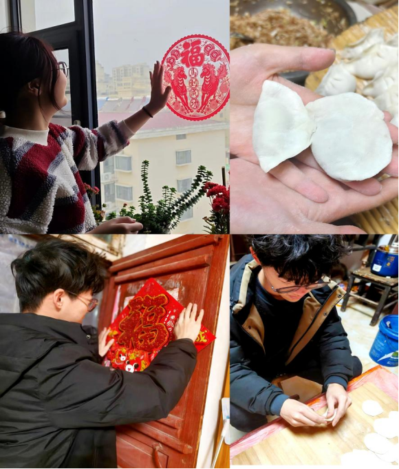 返乡后期,随着春节临近,年俗组成员们在亲身体验中感受年味,领悟中华优秀传统文化的深厚底蕴。包饺子时,从擀皮到包馅,手法虽生疏却格外认真,一个个形态各异的饺子承载着团圆与温馨;贴窗花时,鲜红的剪纸映着笑脸,精巧的图案寓意吉祥如意,洋溢着新年的喜庆气息;聆听鞭炮声响,感受辞旧迎新的热闹氛围,体会传统年俗中对美好生活的期盼。
