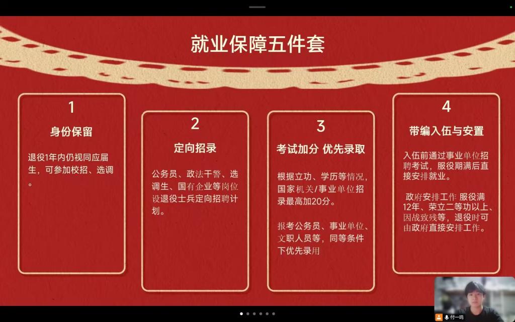 为引导青年学子投身国防事业,11月20日下午,机电工程学院以线上会议形式举办征兵宣讲活动。本次活动由山东建筑大学机电工程学院就业指导中心征兵就业服务部部长付一鸣主讲,学院征兵辅导员、毕业班学生及低年级意向参军同学参与,线上参会人数超50人。