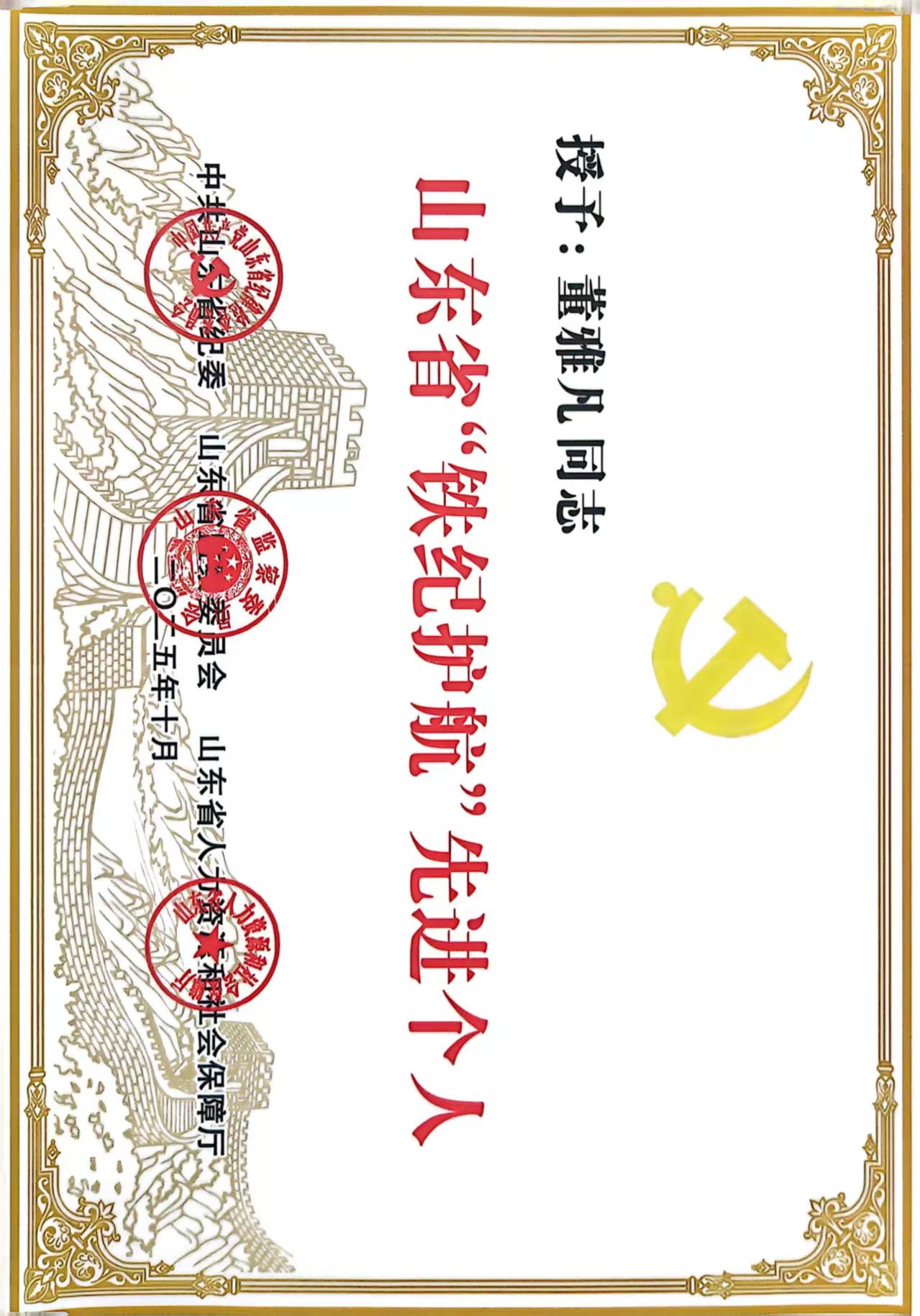 近日,中共山东省纪委机关、山东省监察委员会、山东省人力资源和社会保障厅印发《关于表彰山东省“铁纪护航”先进集体和先进个人的通报》(鲁人社办发〔2025〕8号),授予50个集体“山东省‘铁纪护航’先进集体”称号,授予120名同志“山东省‘铁纪护航’先进个人”称号。