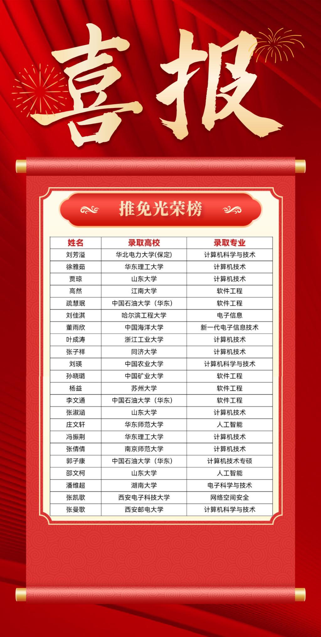 奋楫笃行展风采,逐梦研途启新章。在 2026 年推荐优秀应届本科毕业生免试攻读研究生工作中,山东建筑大学计算机与人工智能学院传来捷报,共有 22 名同学凭借优异的专业成绩与突出的综合素养,成功获得国内知名高校的推免资格。