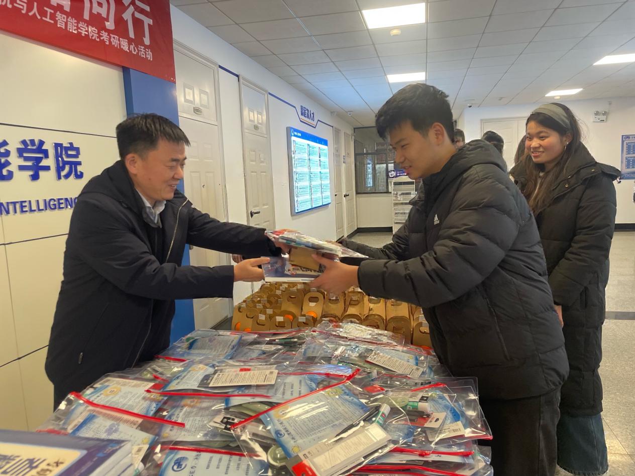调研结束后,黄晓广参加了学院举办的考研暖心活动,亲自为备考学子发放“考研加油包”,其中包含辅导书籍、考试文具及寓意“心想事成”的橙子,并勉励同学们坚定信心、沉着应考,祝愿大家考研上岸、前程似锦。现场暖意融融,同学们纷纷表示,学校的关怀既是鼓励也是动力,必将全力以赴、不负期望。