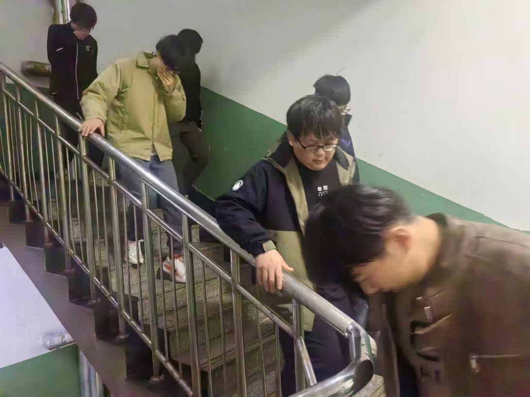 当日下午15时,演练正式启动。随着烟雾发生器启动,楼内模拟火情扩散、烟雾弥漫,消防警报应声响起。参与人员立即停止手头事务,迅速拿起提前准备的湿毛巾捂住口鼻,采取弯腰低姿的防护姿势,在党员干部及学生会、自律会引导员的有序疏导下,沿预设疏散路线快速撤离。过程中,引导员实时提醒大家保持安全间距,避免拥挤推搡,注意脚下安全,针对行动稍慢的参与者及时提供协助。全体人员严格遵守演练纪律,沉着冷静配合,仅用4分钟便全部安全撤离至信息楼外指定集合点,完成人数清点,无人员遗漏或意外情况发生。