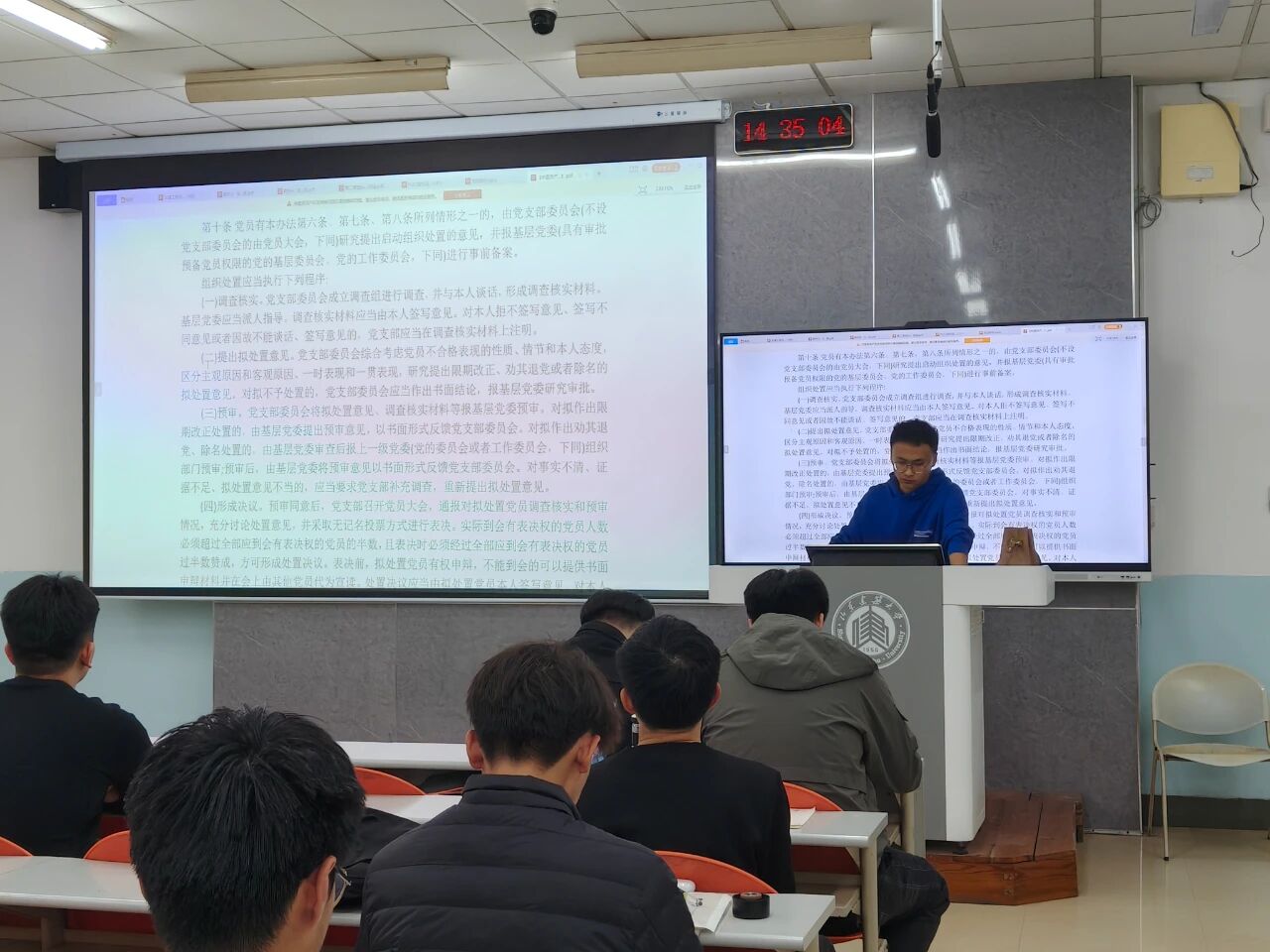 在经验分享环节中,学生第三党支部党员王本毅同学结合自身经历,进行了保研经验交流。他从学业成绩、科研积累、导师沟通等方面进行了详细讲解,鼓励同学们树立长期目标、保持学习热情、科学规划学业路径。