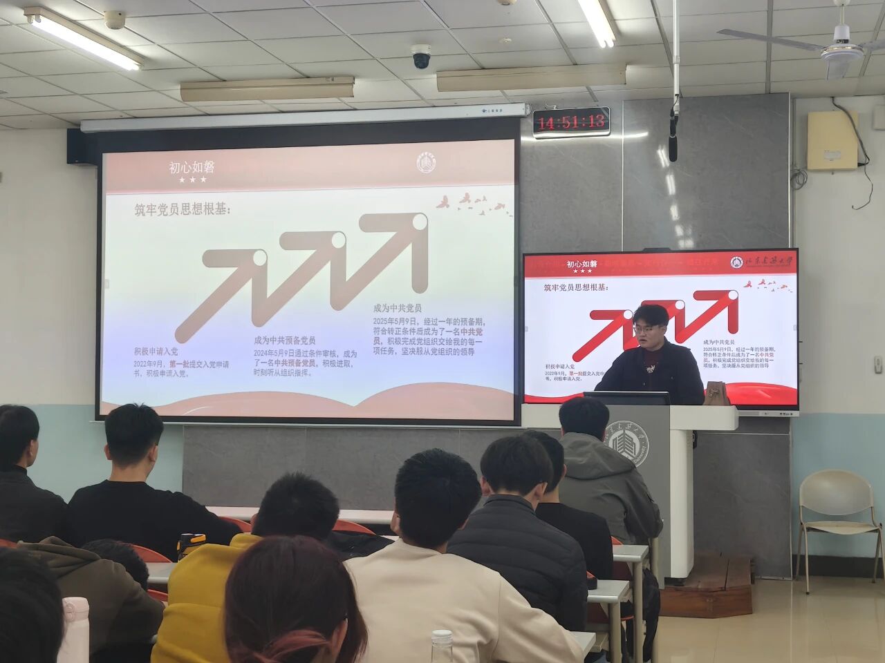 随后,支部党员吴森毓同学围绕就业方向、岗位选择和职业心态等方面进行了分享。他强调,在就业过程中要脚踏实地、主动学习、敢于尝试,把个人奋斗融入社会实践,让青春在实干中闪光。