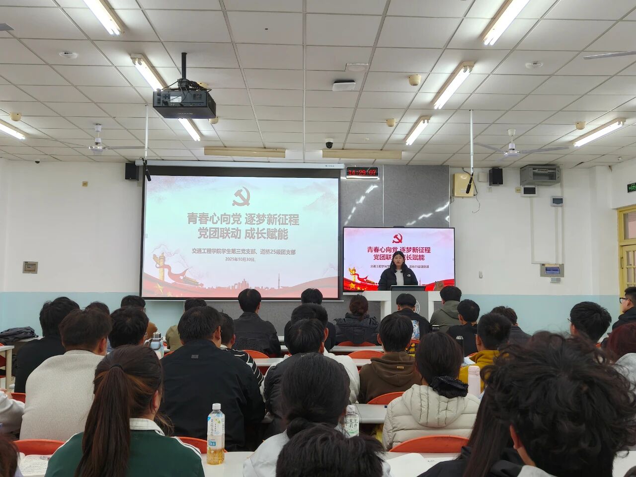 为深入学习贯彻习近平新时代中国特色社会主义思想,落实“党建带团建、团建促党建”的工作要求,充分发挥学生党支部在引领青年成长成才中的战斗堡垒作用,近日,交通工程学院学生第三党支部联合道桥25级团支部于BW102教室举办“青春心向党 筑梦新征程”职业规划主题党团共建活动。