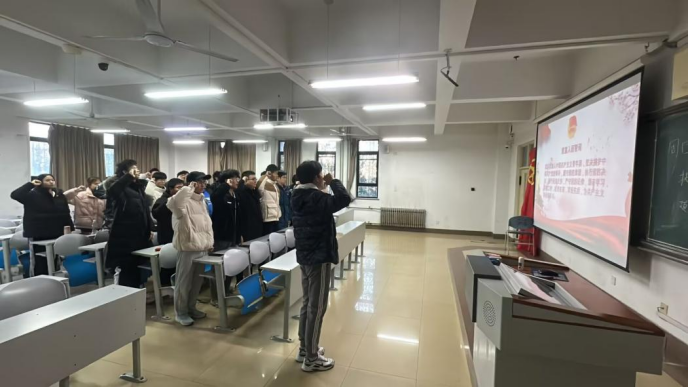 同学们在团支书的带领下学习《国防论苑|挺膺担当 逐梦青春》时下,2023年上半年征兵工作有序展开,青年一代挺膺向前、自觉接受祖国挑选正当其时。通过这一部分的学习同学们学习到新时代青年应挺膺向前,向党和人民展现青年一代顶得上的蓬勃朝气、信得过的沉着静气、扛得住的昂扬锐气、压不垮的浩然正气,在新时代的大潮中激流勇进,诠释青年担当。