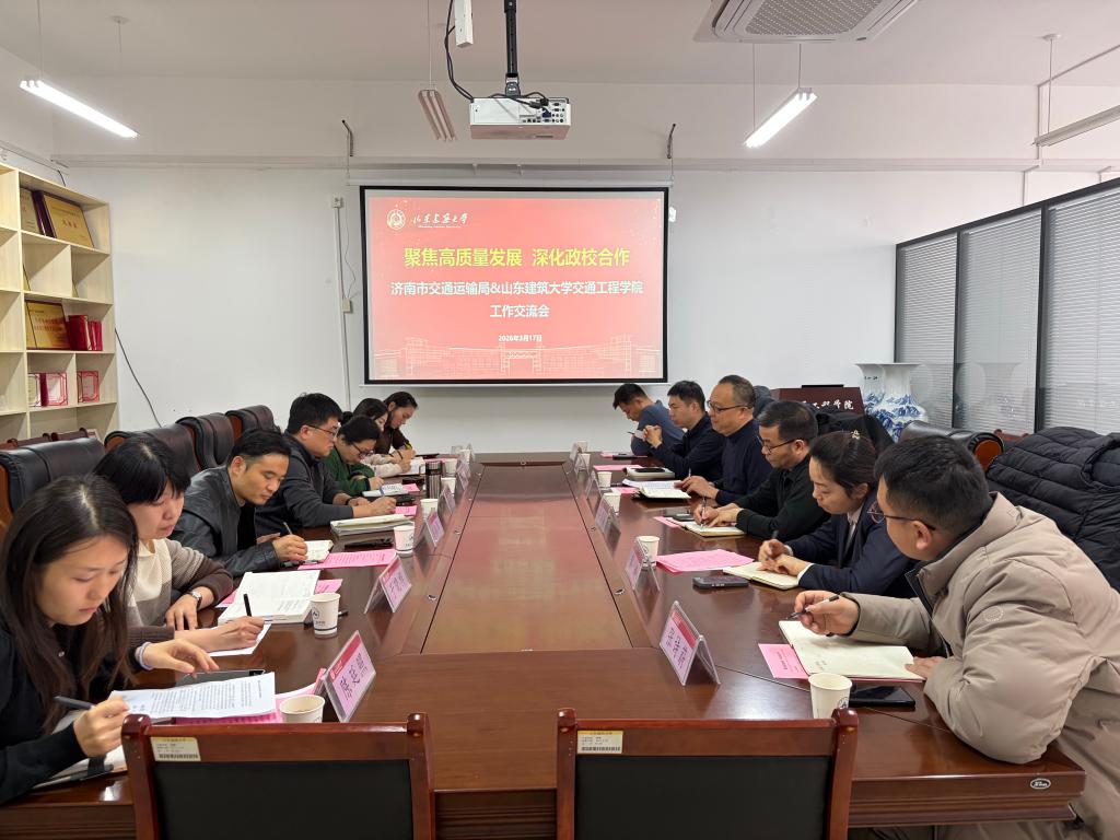 3月17日,济南市交通运输局受邀来校,与交通工程学院开展工作交流。济南市交通运输局由轨道交通处处长汤晓带队,市交通运输事业发展中心、济南轨道交通集团运营公司、济南公交集团、山东轨道交通勘察设计院城交院、济南轨道交通集团运营公司等行业专家出席会议,会议由山东建筑大学交通工程学院党委书记张立新主持,学院相关负责人、教师参加。