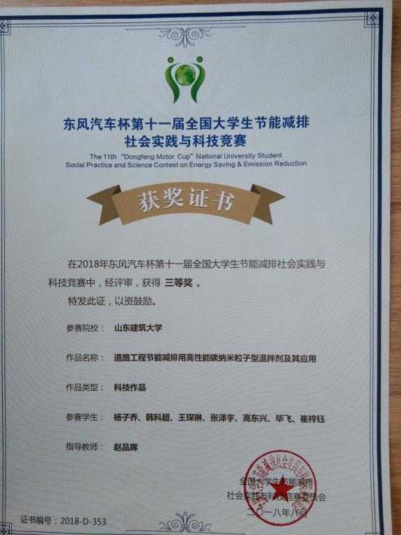 第十一届全国大学生节能减排社会实践与科技竞赛三等奖——道路工程节能减排用高性能碳纳米粒子型温拌剂及其应用