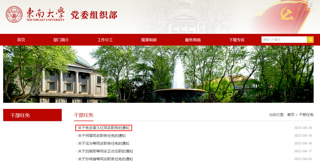 ▲4月24日,东南大学官网显示的对袁久红免职通知。图/东南大学官网