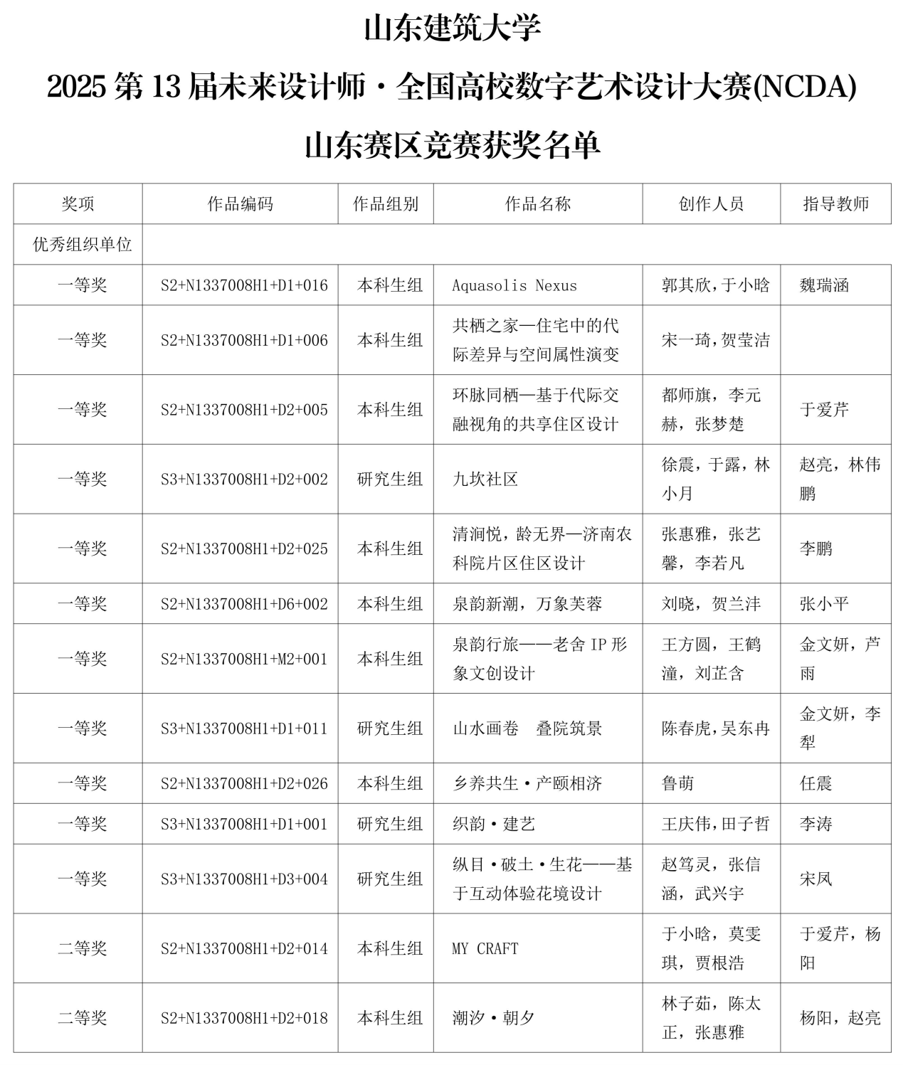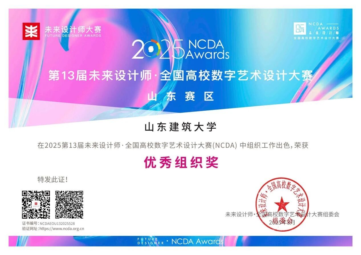 近日,2025第13届未来设计师・全国高校数字艺术设计大赛(NCDA)山东赛区及全国总决赛结果相继公布。山东建筑大学建筑城规学院师生喜获全国总决赛奖项5项,其中一等奖1项、二等奖2项、三等奖2项。省赛阶段共获41个奖项,其中包含一等奖11项、二等奖13项、三等奖17项。此外,学院教师获得多项“优秀组织教师”及“优秀指导教师”,山东建筑大学荣获“优秀组织奖”。
