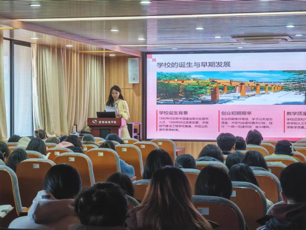 宣讲会上,段若楠以学校六十九载发展历程为主线,开篇即点明学校“植根齐鲁文化、与国家建设同呼吸共命运”的发展底色,从1956年济南城市建设工程学校奠基创立的初心讲起,系统梳理了学校从中专到本科、从单一学科到多科融合、从传统办学到特色发展的跨越式成长轨迹。通过开创山东建筑高等教育先河、建大师生义务助力传统村落改造等典型案例,让学生深刻体悟到校史背后凝结的精神基因。结合新时代发展要求,重点介绍了学校立足“双碳”战略与新型城镇化发展需求,进行绿色建筑与智能建造技术创新的实践探索,详细解读了国家建筑绿色低碳技术创新中心复合竹结构联合研究中心揭牌奠基、古建保护与乡村遗产数字化研究等重点工作的时代意义,强调了学校“为国家建设筑牢基础、成就事业”的庄严承诺。同时引用校史中建筑平移、古建复建等特色实践案例,寄语全体学员要传承“知行合一”的优良传统,将个人成长融入国家发展大局。