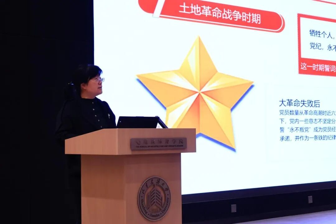 在党课授课环节,建筑城规学院党委书记董欲晓、马克思主义学院教学办主任宋春苗、建筑城规学院学工办主任白林、建筑城规学院党建辅导员周广晴先后进行了授课。董欲晓讲授党课《诠释对党绝对忠诚》,系统梳理入党誓词的变化脉络,深刻阐释“对党绝对忠诚”这一根本政治要求的思想渊源、历史逻辑与时代价值,激励青年学生自觉强化理论武装,坚持不懈用习近平新时代中国特色社会主义思想凝心铸魂,在担当作为、履职尽责、攻坚克难中践行忠诚誓言。宋春苗以《以青春之我 赴现代化之约》为主题,从看“十四五”成就、判当前形势、析目标举措、答青年何为几个方面领学党的二十届四中全会精神,引导学生深化对党的创新理论的理解,为推进中国式现代化贡献智慧与担当。白林作《党旗引航溯初心,党徽凝力铸强魂》专题授课,全面解读了党徽党旗的规范使用与精神内涵,引导学生深刻领会条例要求,增强政治意识和组织观念,以规范言行筑牢党员初心使命。周广晴围绕《循党章明方向 守党纪知敬畏》主题,系统解读党章核心内容与纪律要求,引导学员严守政治规矩,增强宗旨意识,以实际行动践行初心使命。最后,学院组织观看红色电影《志愿军2》,再现革命先辈的英勇事迹,激发青年学子传承红色基因、勇担时代使命。
