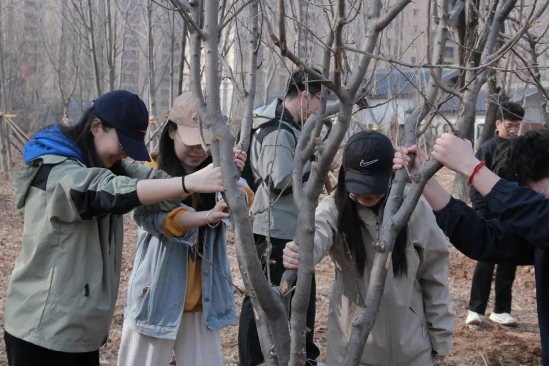 活动当天,师生齐聚校园西门生态区,在后勤处的专业指导下,分组协作栽种海棠兼具观赏性与生态价值的树种。师生党员与团员发挥先锋模范作用,挥锹培土、扶苗浇水,将课堂中学习的生态规划理念转化为脚下实实在在的“绿色行动”。风景园林专业学生现场讲解植物搭配与空间营造技巧,将生态效益与美学设计相融合。学校后勤处为活动提供了苗木、工具及技术保障,并计划对栽种区域进行长期养护。