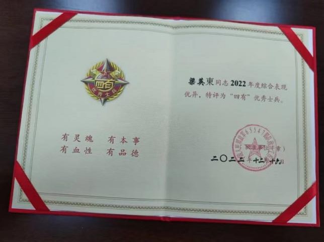 在服役期间,我作为履带式装甲车驾驶员,始终以高标准严格要求自己,于2022年12月荣获“四有优秀士兵”称号并获嘉奖。同时,我积极投身重大任务,先后参与大连野外驻训、营连战术综合演习及“跨越朱日和—B”演习,并因演习任务推迟一个月退伍。从朱日和满载荣誉告别军营后,我将“有灵魂、有本事、有血性、有品德”的军人特质深植于心。军旅生涯不仅锤炼了我坚韧不拔的意志和严谨务实的作风,更培养了我高度的责任感与执行力,为我后续的学习与工作奠定了坚实基础。