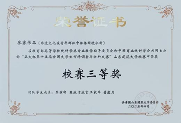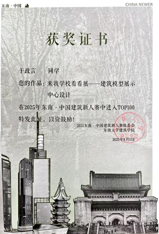 凭借踏实努力与全面表现,我先后荣获19项荣誉表彰,其中包括一等奖学金、优秀学生标兵、优秀团员标兵、优秀学生干部、志愿服务先进个人等16项校级荣誉,优秀朋辈导师、优秀社会实践个人等3项院级荣誉。同时,我积极参与各级各类竞赛,不断突破自我,在2025东南新人赛中获TOP100。