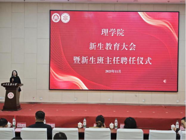 11月5日,理学院在博学会堂举办新生教育大会暨新生班主任聘任仪式。校团委书记杨菁、学生工作部副部长周秀艳,学院党政领导班子、全体辅导员、新生班主任代表、教师代表及25级全体新生共同参加。会议设主会场与两个分会场,通过直播同步进行。会议由学院党委副书记贾德芳主持。