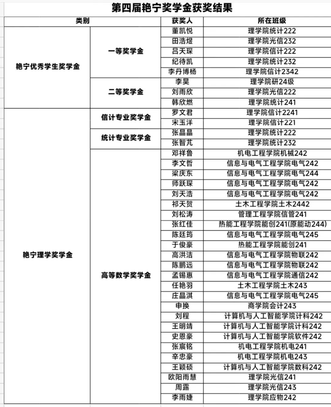 大家翘首以盼的第四届“艳宁奖学金”评选圆满落幕,结果新鲜出炉!根据《理学院艳宁奖学金评选办法》,经学生自主申请、资格审查、现场答辩、学院评审等环节,现将理学院第四届艳宁奖学金评审结果公布如下: