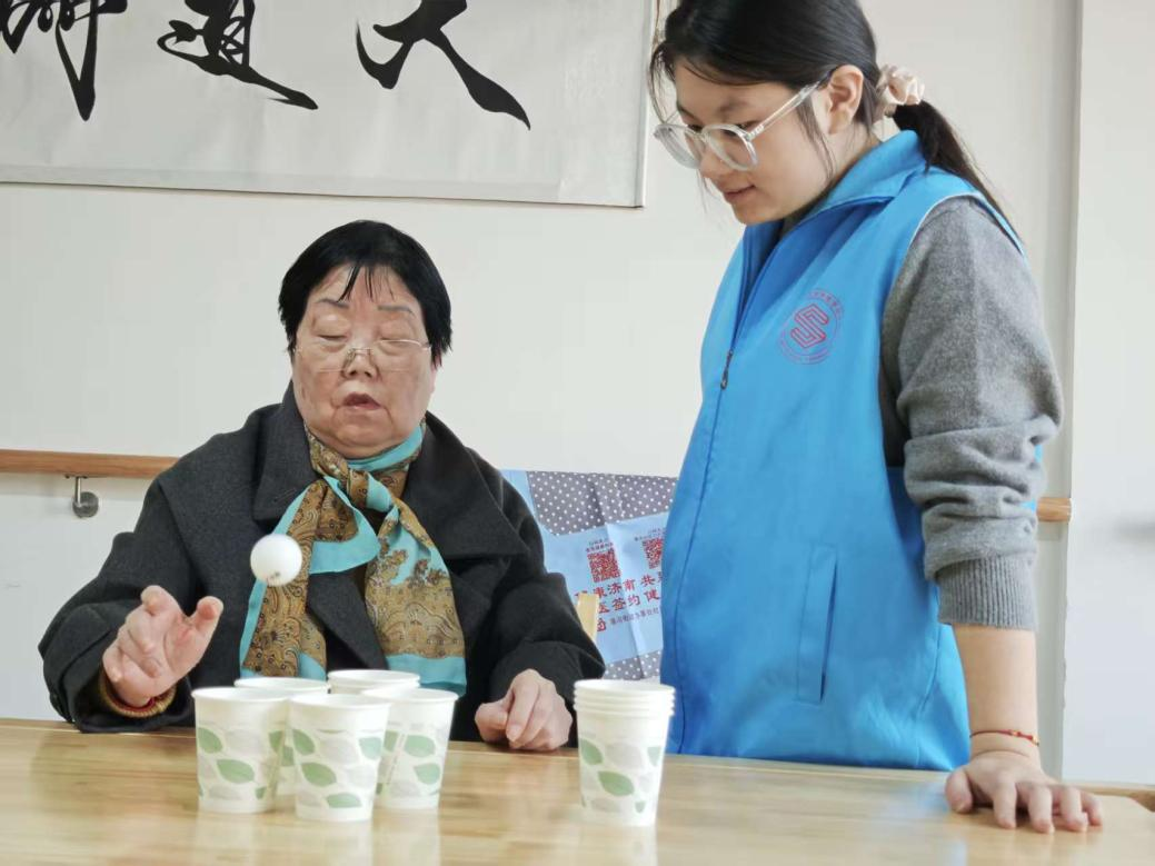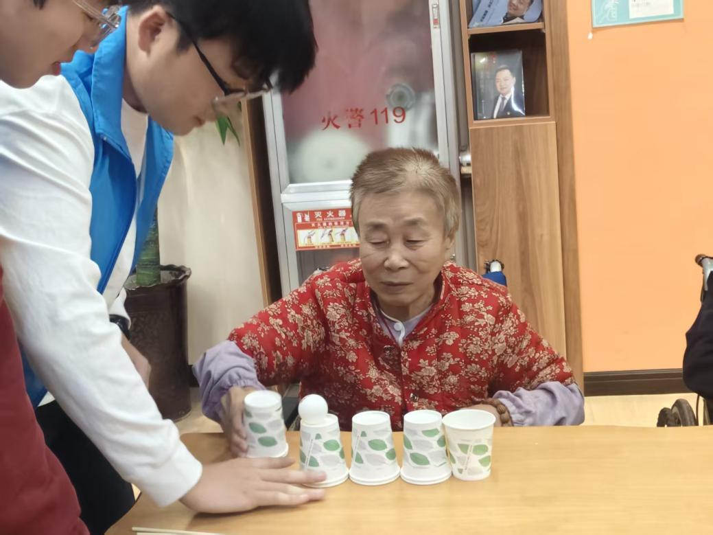 纸杯套娃游戏环节,志愿者们提前将一次性纸杯摆成小巧的金字塔造型,把乒乓球稳稳放在最顶端的纸杯上。“爷爷,您慢慢来,小心别让乒乓球掉下来哦!”志愿者们在一旁轻声鼓励,老人们全神贯注地依次挪动纸杯,当最后一个纸杯成功叠合,乒乓球安稳“落座”时,老人们露出了欣喜与满足的笑容。