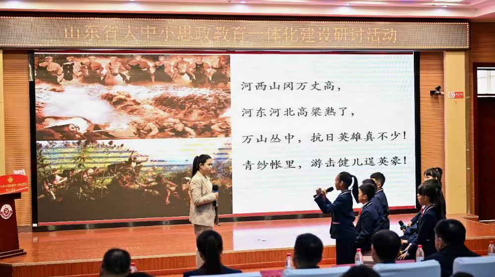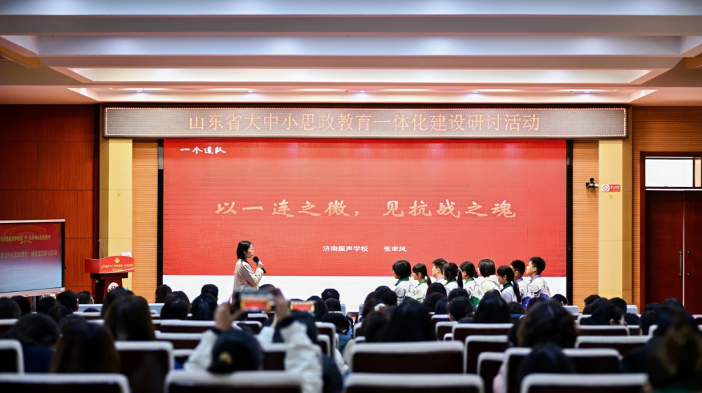 山东省教育厅思政处(宣教处)处长陈成标,济南市教育局党组成员、副局长王志国,历下区教育和体育局党组成员、副局长王咸阳出席活动。历下区教育教学研究中心副主任董晓杰为研讨活动致辞。他指出,历下区近年来以“高效引领、中小联动、全段贯通”为核心,持续推动思政教育从分段走向系统,让思政课成为学生终身受益的“金课”。课例展示环节,来自大中小学段的四位教师聚焦抗战精神,基于学段特点创设生动适切的情境,引导学生学习和领悟精神内涵。课堂情意深切,现场的师生不禁动容。